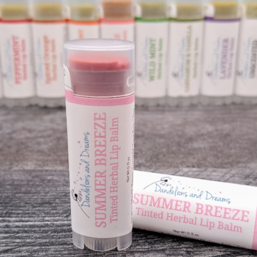Summer Breeze Tinted Lip Balm has a cooling peppermint flavor with just a hint of pink shimmer added to give your lips a lightly frosted look