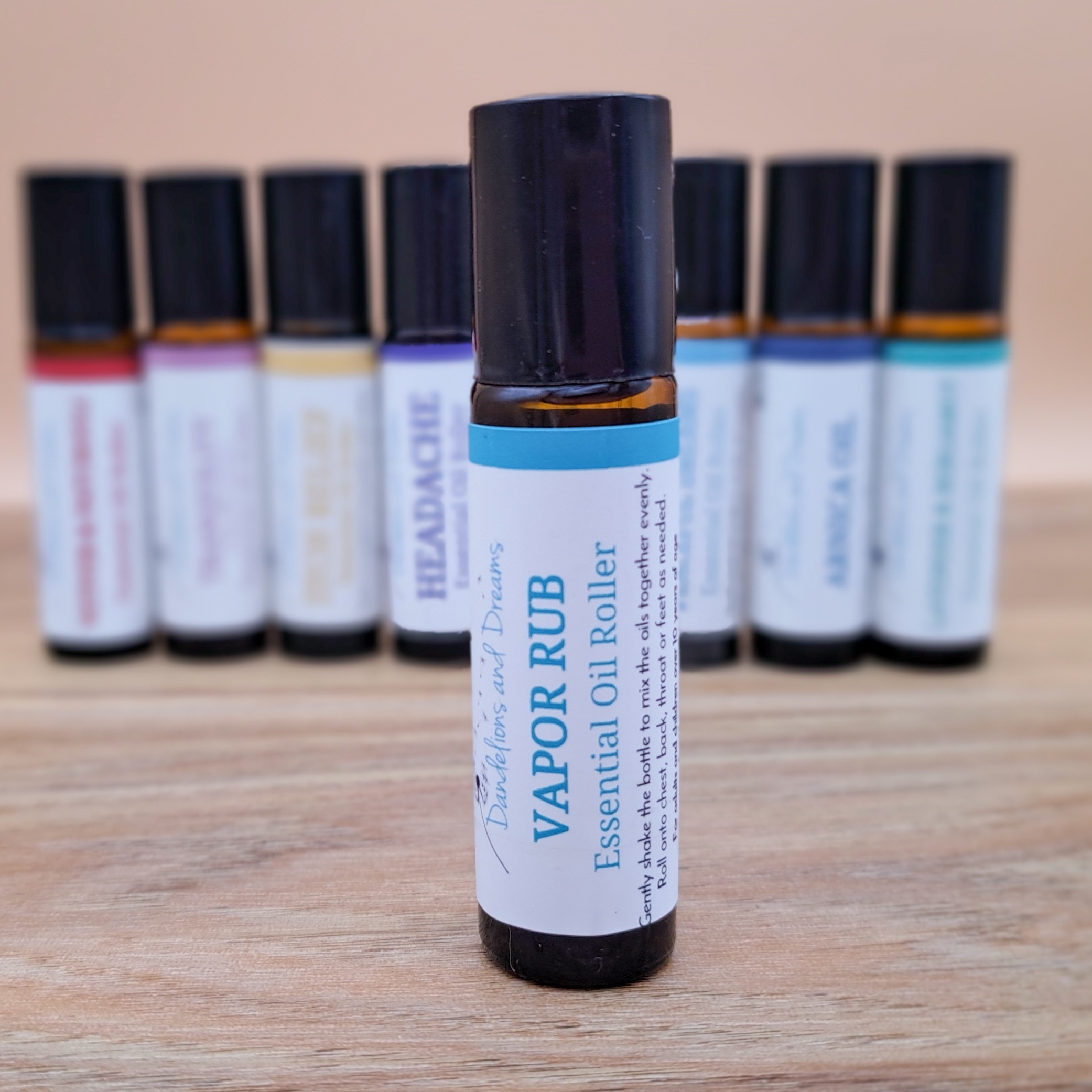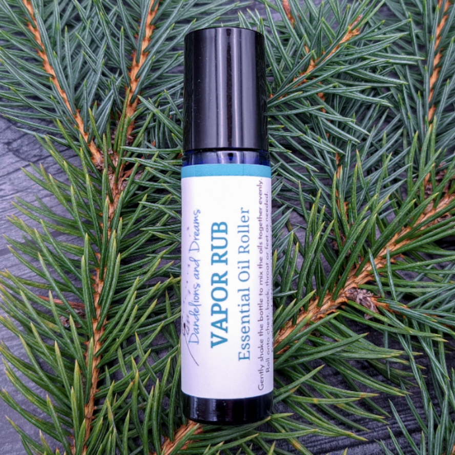 A natural alternative to traditional vapor rubs. Formulated with a blend of essential oils to help open the sinuses and clear chest congestion from colds and allergies. This Vapor Rub roller bottle is formulated for adults and kids over 10 years of age. Gently shake the bottle to mix the oils together evenly. Roll onto chest, back, throat or feet as needed.